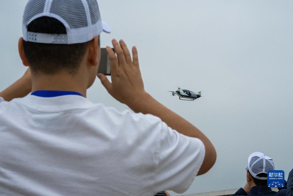 9月22日,在湖南株洲蘆淞機場(chǎng),觀(guān)眾在拍攝一輛無(wú)人駕駛的飛行汽車(chē)。