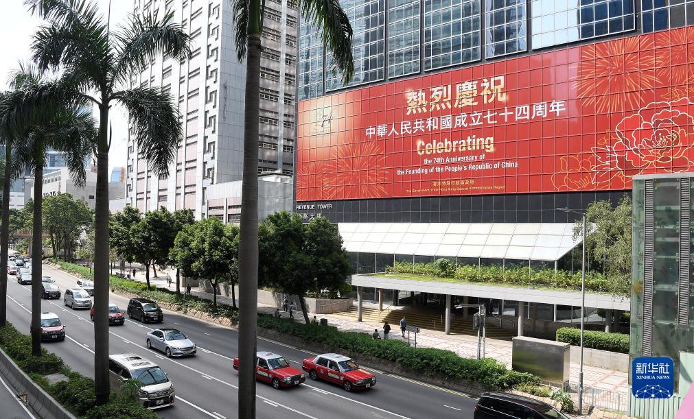國慶節將至,香港街頭張貼國慶海報,慶祝中華人民共和國成立74周年。