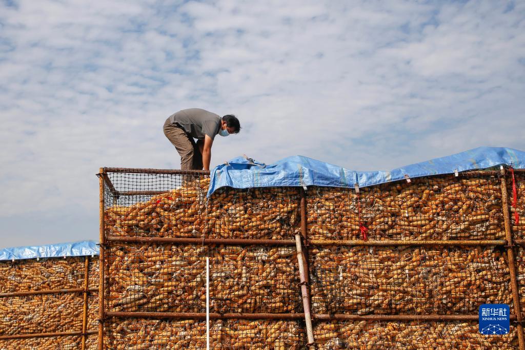 9月22日,在寶豐縣鬧店鎮一家糧食收購企業(yè),工作人員為存儲玉米的鐵籠鋪蓋防雨布。
