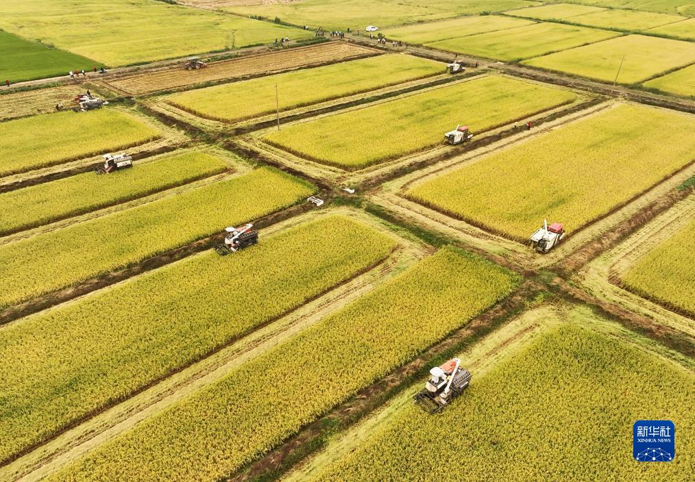 9月23日,在湖南省衡陽(yáng)市衡陽(yáng)縣庫宗橋鎮,農機手駕駛農機在收割稻谷(無(wú)人機照片)。