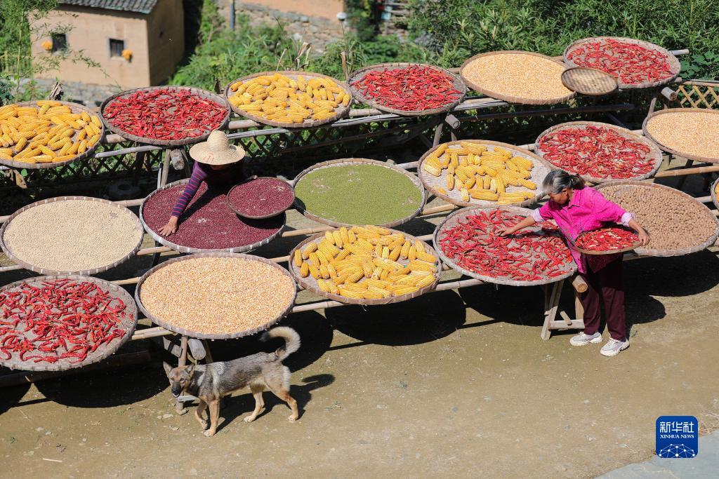 9月18日,在黃山市歙縣陽(yáng)產(chǎn)村,村民在曬場(chǎng)上晾曬農作物。