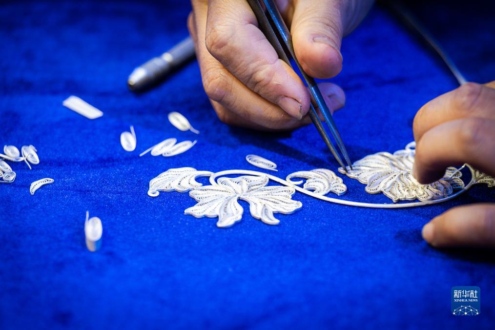 9月21日,選手李靜在現場(chǎng)展示花絲首飾制作技藝。