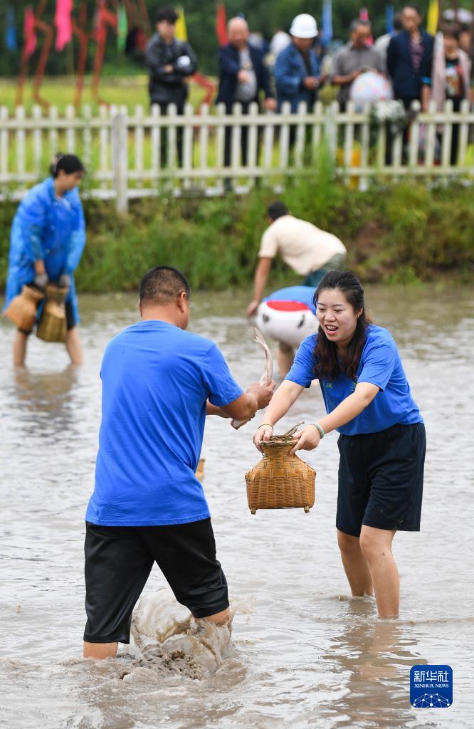 這是9月23日在重慶市璧山區七塘鎮將軍村拍攝的趣味摸魚(yú)活動(dòng)現場(chǎng)。