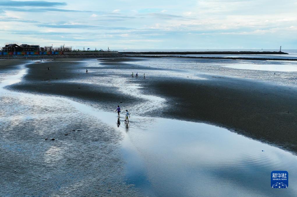 9月16日,游客在江蘇省啟東市“十里海灣”灘涂上游玩(無(wú)人機照片)。