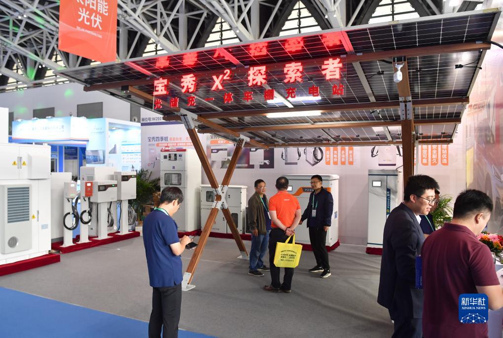2023歐亞經(jīng)濟論壇經(jīng)貿合作博覽會(huì )暨中國(陜西)進(jìn)出口商品展上展出的光儲充一體車(chē)棚充電站(9月22日攝)。新華社記者 邵瑞 攝