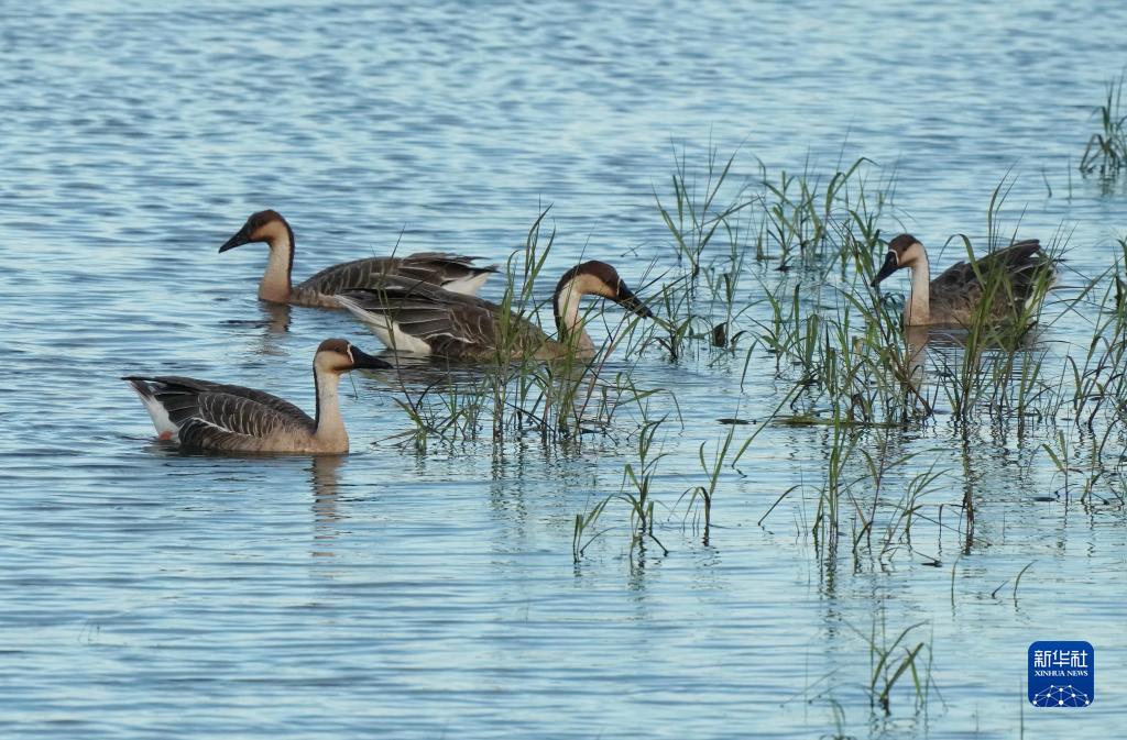 9月23日,四只鴻雁在河北省秦皇島市北戴河區沿海濕地覓食。
