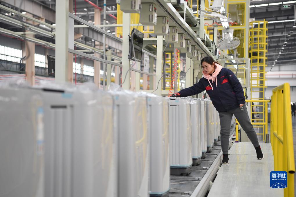 在西安國際港站附近的一家家電生產(chǎn)企業(yè)內,工人在生產(chǎn)線(xiàn)上組裝洗衣機(2月22日攝)。