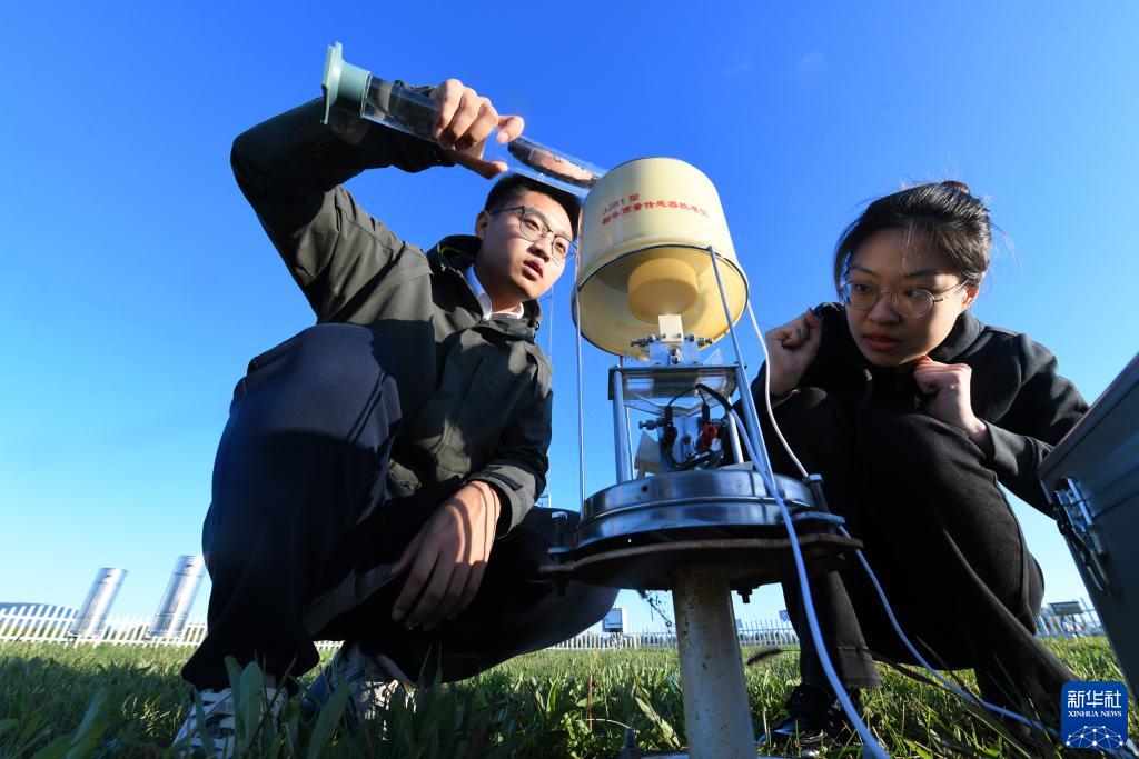 在富錦市氣象局觀(guān)測場(chǎng),氣象員張靖澤(左)與楊清彤在維護翻斗雨量計(9月22日攝)。