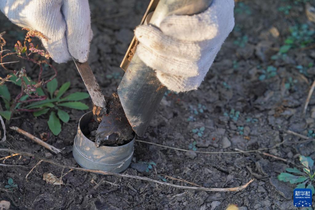在富錦市一固定地段,氣象員張靖澤在取土壤樣本(9月22日攝)。