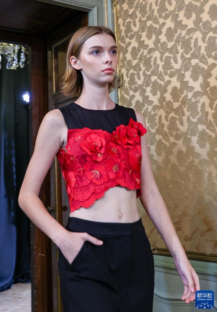9月23日,模特在意大利米蘭時(shí)裝周上展示楚雄彝繡女裝。