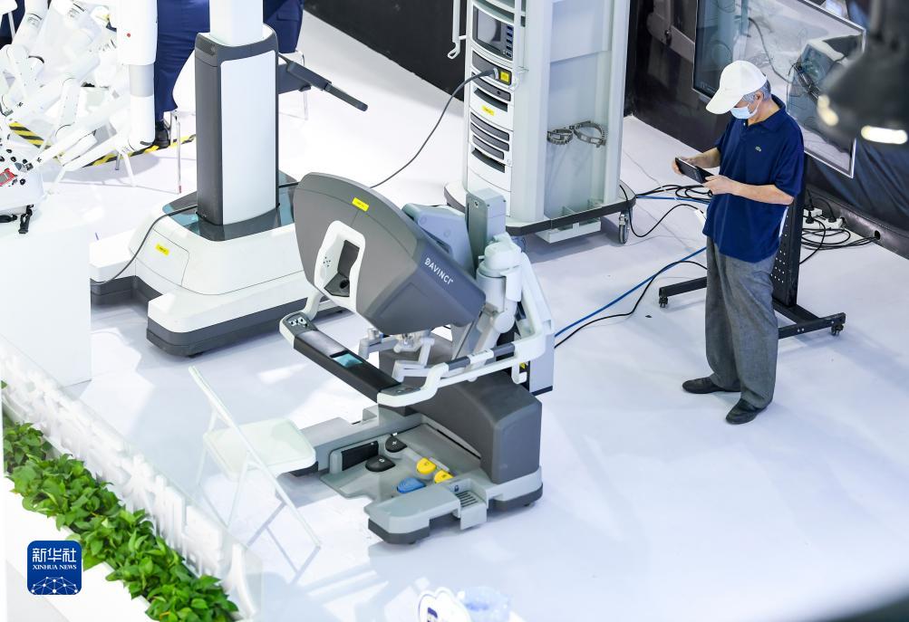 9月23日,一名觀(guān)眾在第六屆中國-阿拉伯國家博覽會(huì )醫療康養展區觀(guān)看拍攝手術(shù)機器人。