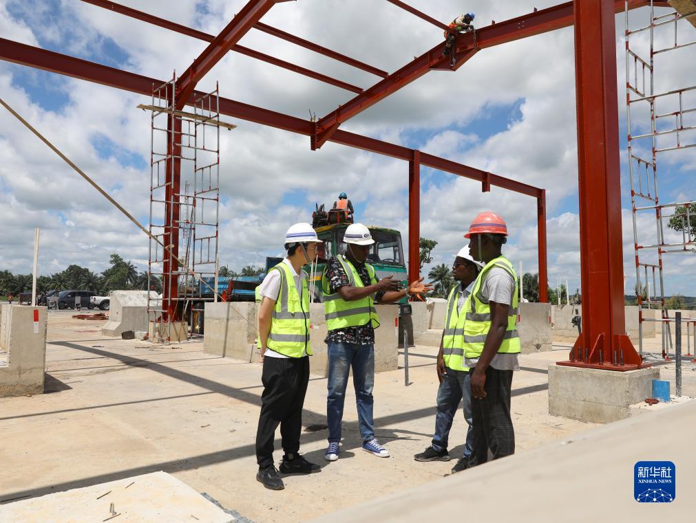 9月20日,中國工程師王蔣明(左一)與尼日利亞工程師蒂賈尼 (左二)在尼日利亞凱菲路一期工程收費站建設工地檢查工程質(zhì)量。