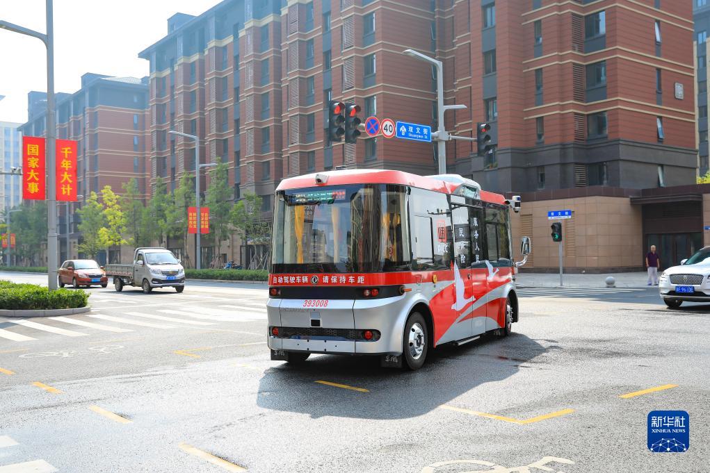 一輛智能網(wǎng)聯(lián)巴士在雄安新區容東片區道路上行駛(9月18日攝)。