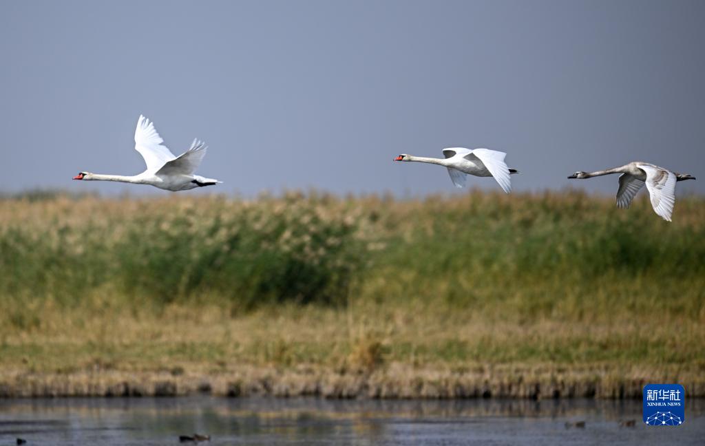 烏梁素海,意為“紅柳湖”,位于黃河“幾字彎”頂部,是黃河流域最大的湖泊濕地。近年來(lái),隨著(zhù)烏梁素海生態(tài)治理力度不斷加大,生態(tài)成果也不斷顯現。各類(lèi)候鳥(niǎo)在這里安了家,本來(lái)前往西伯利亞的疣鼻天鵝也在烏梁素海產(chǎn)卵孵化生活,烏梁素海成為我國最大的疣鼻天鵝繁殖基地。近日,在烏梁素海湖面上,成年疣鼻天鵝帶領(lǐng)幼鳥(niǎo)練習飛翔,準備為過(guò)冬前的長(cháng)途遷徙做準備。