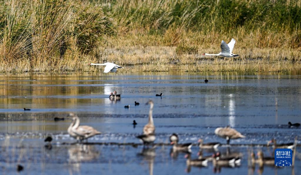 烏梁素海,意為“紅柳湖”,位于黃河“幾字彎”頂部,是黃河流域最大的湖泊濕地。近年來(lái),隨著(zhù)烏梁素海生態(tài)治理力度不斷加大,生態(tài)成果也不斷顯現。各類(lèi)候鳥(niǎo)在這里安了家,本來(lái)前往西伯利亞的疣鼻天鵝也在烏梁素海產(chǎn)卵孵化生活,烏梁素海成為我國最大的疣鼻天鵝繁殖基地。近日,在烏梁素海湖面上,成年疣鼻天鵝帶領(lǐng)幼鳥(niǎo)練習飛翔,準備為過(guò)冬前的長(cháng)途遷徙做準備。