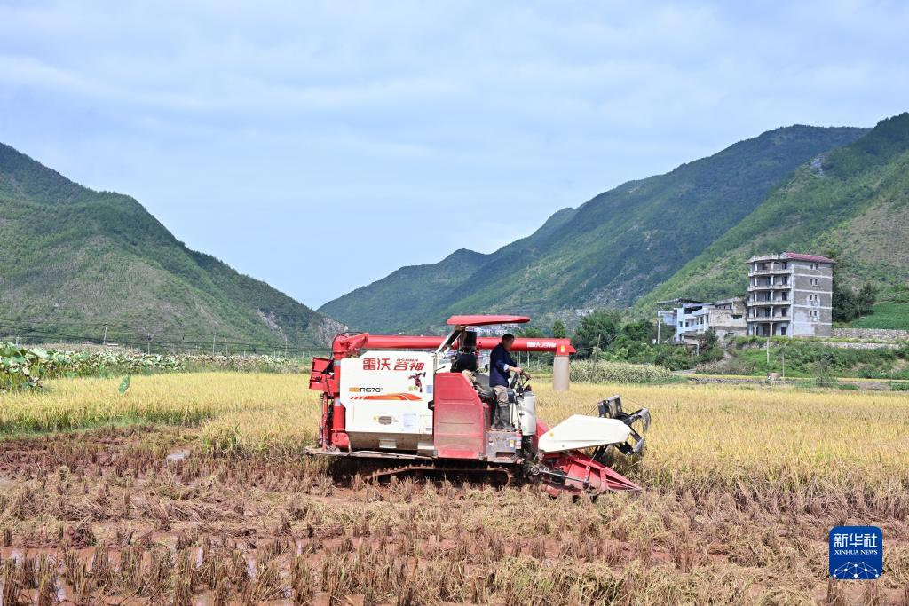 9月25日, 重慶市巫山縣廟宇鎮永安村村民在搶收受災農田里的水稻。