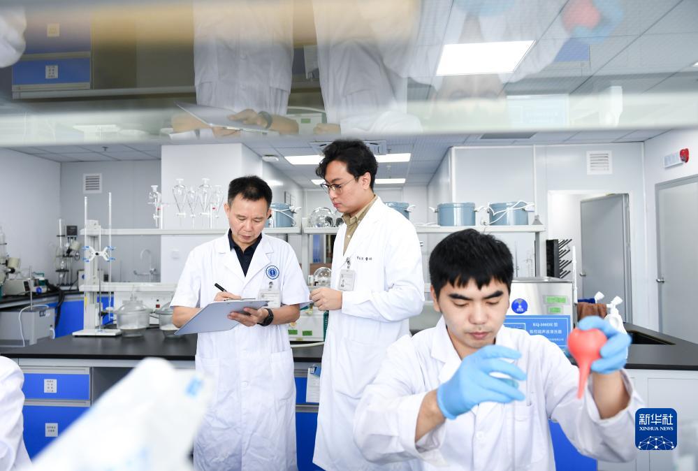 9月4日,郭鈞泯(中)在深圳市中醫藥傳承發(fā)展研究院的實(shí)驗室與副院長(cháng)黃濤陽(yáng)交流。