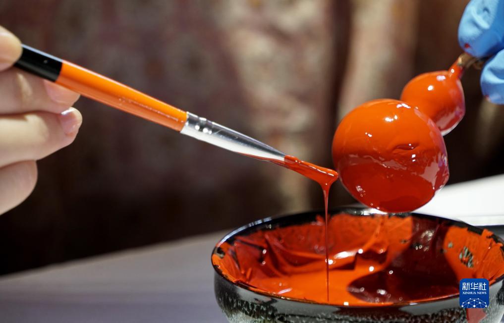 海燕在為葫蘆髹漆準備制作雕漆文創(chuàng )產(chǎn)品(9月8日攝)。