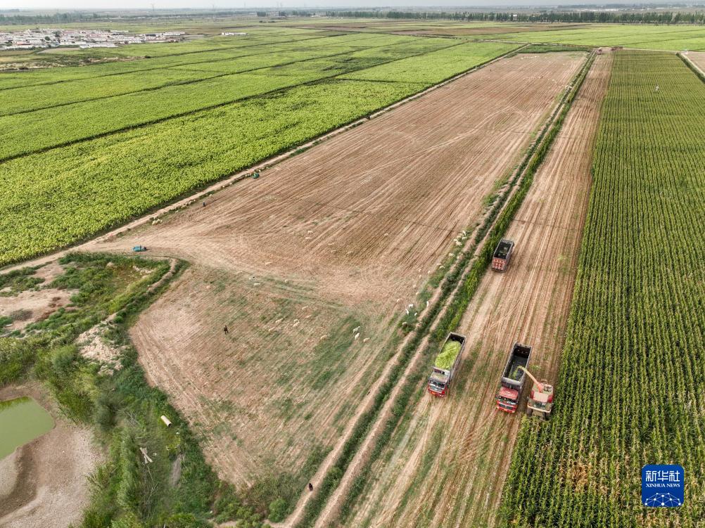 在內蒙古巴彥淖爾市臨河區城關(guān)鎮,收割機在收割青儲玉米(無(wú)人機照片,9月14日攝)。