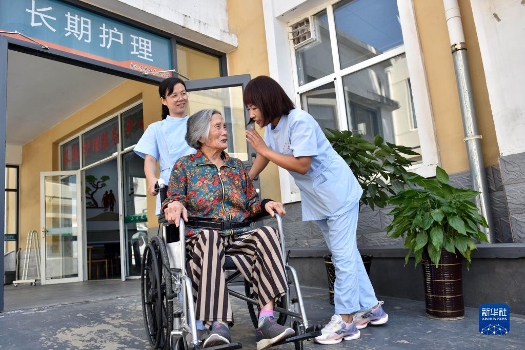9月26日,邢臺市南和區史召鄉衛生院醫養中心工作人員在庭院陪老人散心。