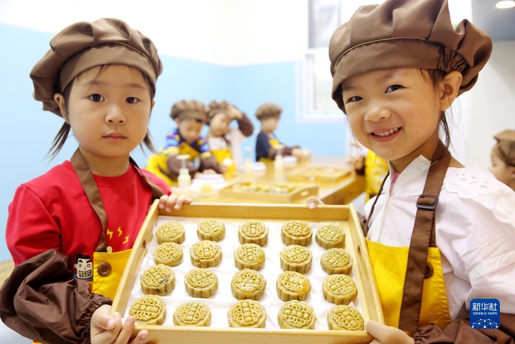 9月26日,在江蘇省連云港市一家幼兒園,小朋友展示自己動(dòng)手制作的月餅。