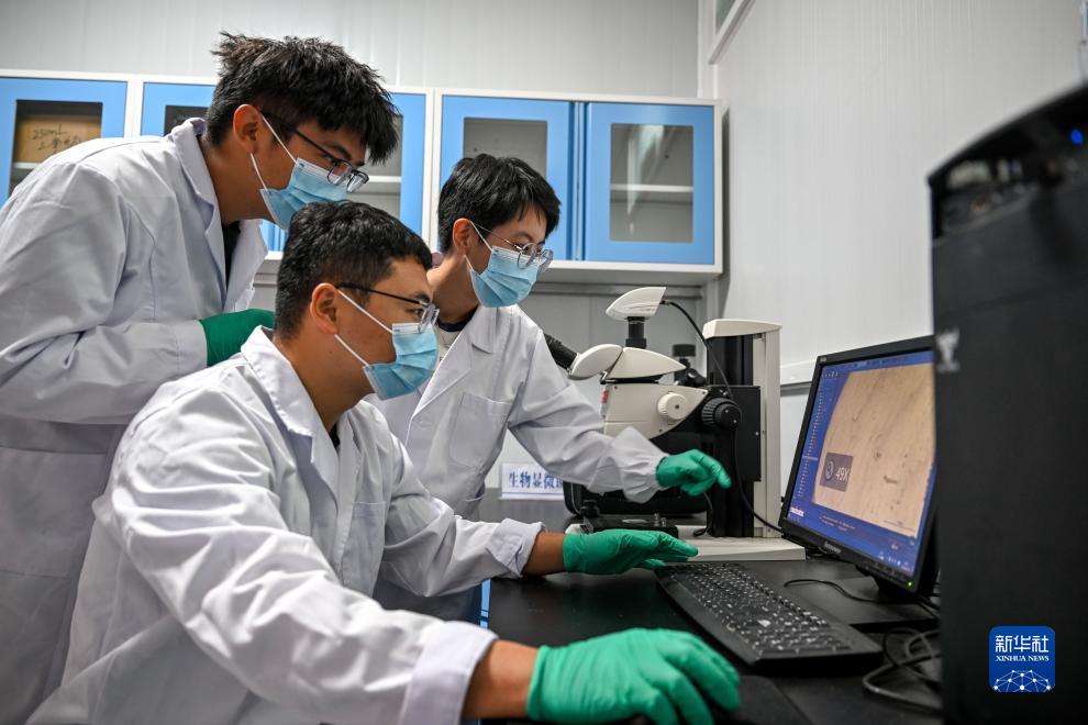 9月14日,武蓉(右一)和同學(xué)用顯微鏡觀(guān)察水樣中的微塑料。
