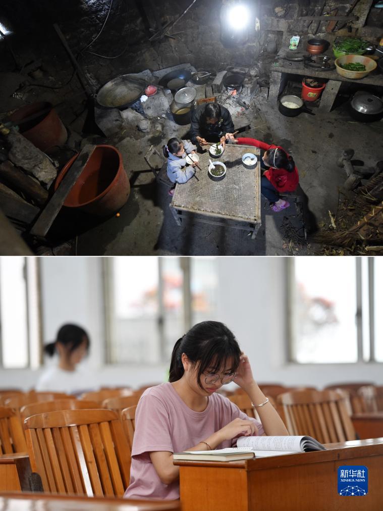這是一張拼版照片,上圖為:在廣西都安瑤族自治縣拉烈鎮崇業(yè)村弄后屯,藍曉萍(右)和妹妹藍云萍(左)、父親藍啟站在吃早飯(2015年4月14日攝);下圖為:在廣西南寧師范大學(xué),藍曉萍在教室里學(xué)習(2023年9月26日攝)。