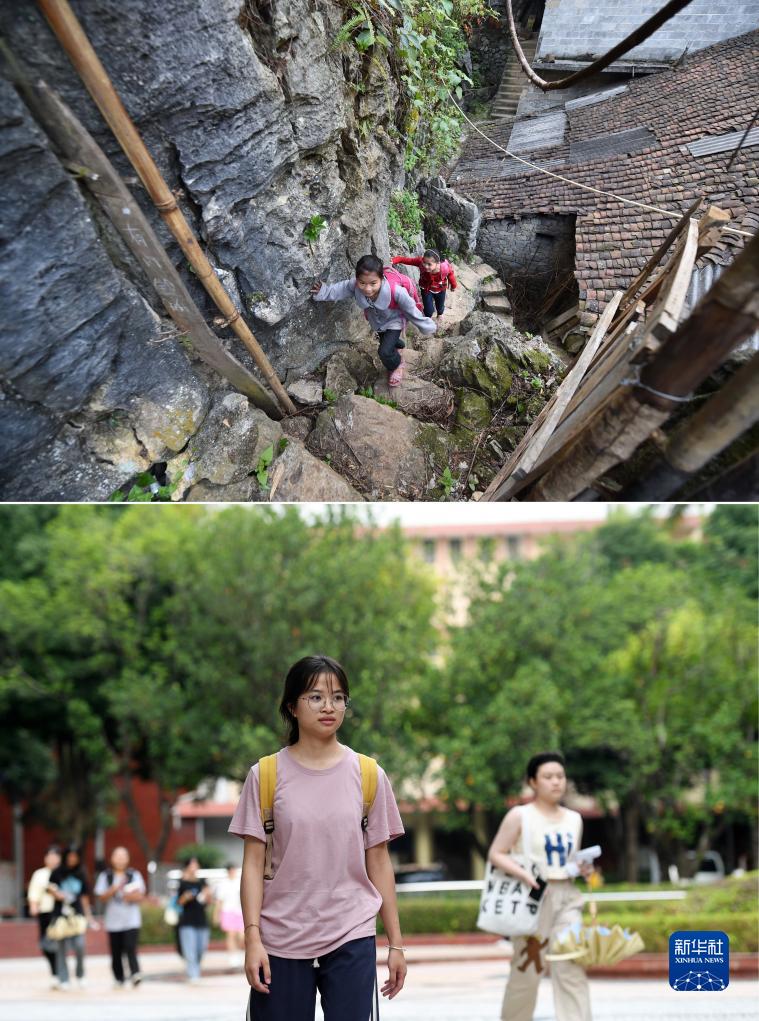 這是一張拼版照片,上圖為:在廣西都安瑤族自治縣拉烈鎮崇業(yè)村弄后屯,藍曉萍(后)和妹妹藍云萍走在上學(xué)的路上(2015年4月14日攝);下圖為:在廣西南寧師范大學(xué),藍曉萍走在校園里(2023年9月26日攝)。