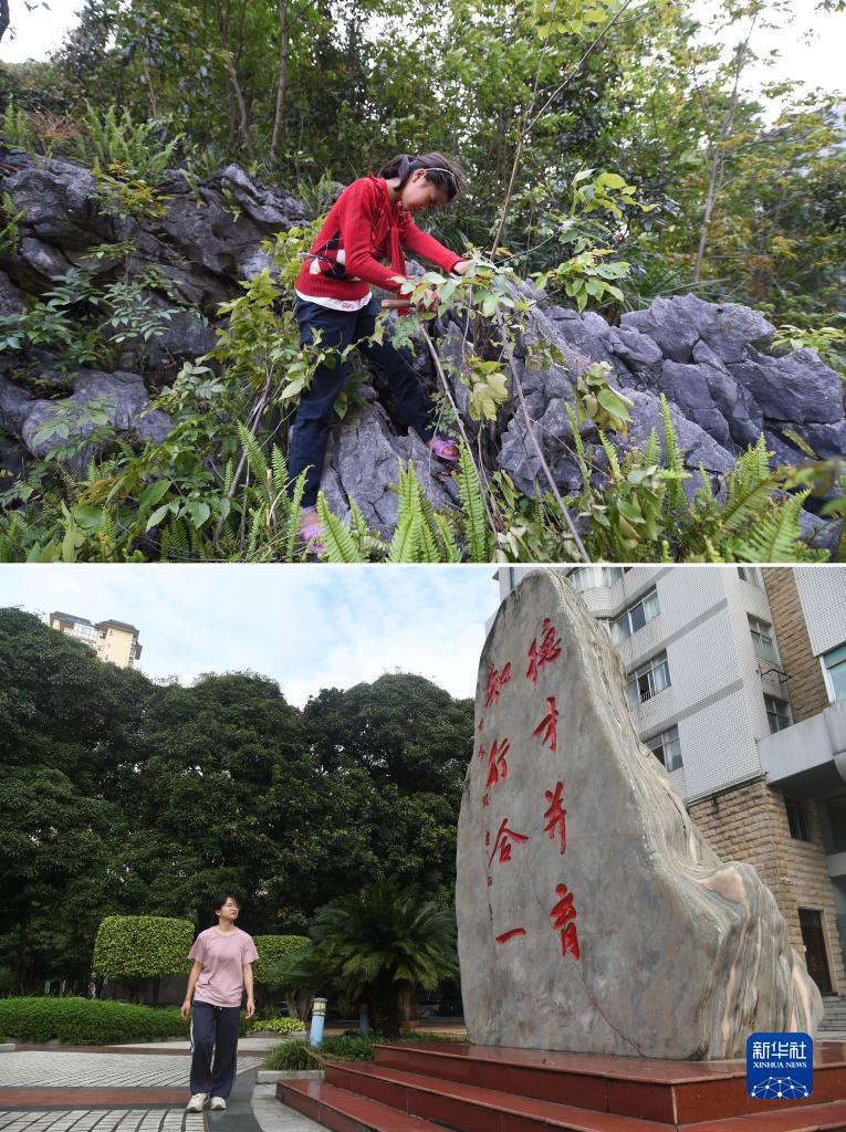 這是一張拼版照片,上圖為:在廣西都安瑤族自治縣拉烈鎮崇業(yè)村弄后屯,藍曉萍放學(xué)回家后在山上一邊放羊一邊砍柴(2015年4月14日攝);下圖為:在廣西南寧師范大學(xué),藍曉萍走在校園里(2023年9月26日攝)。