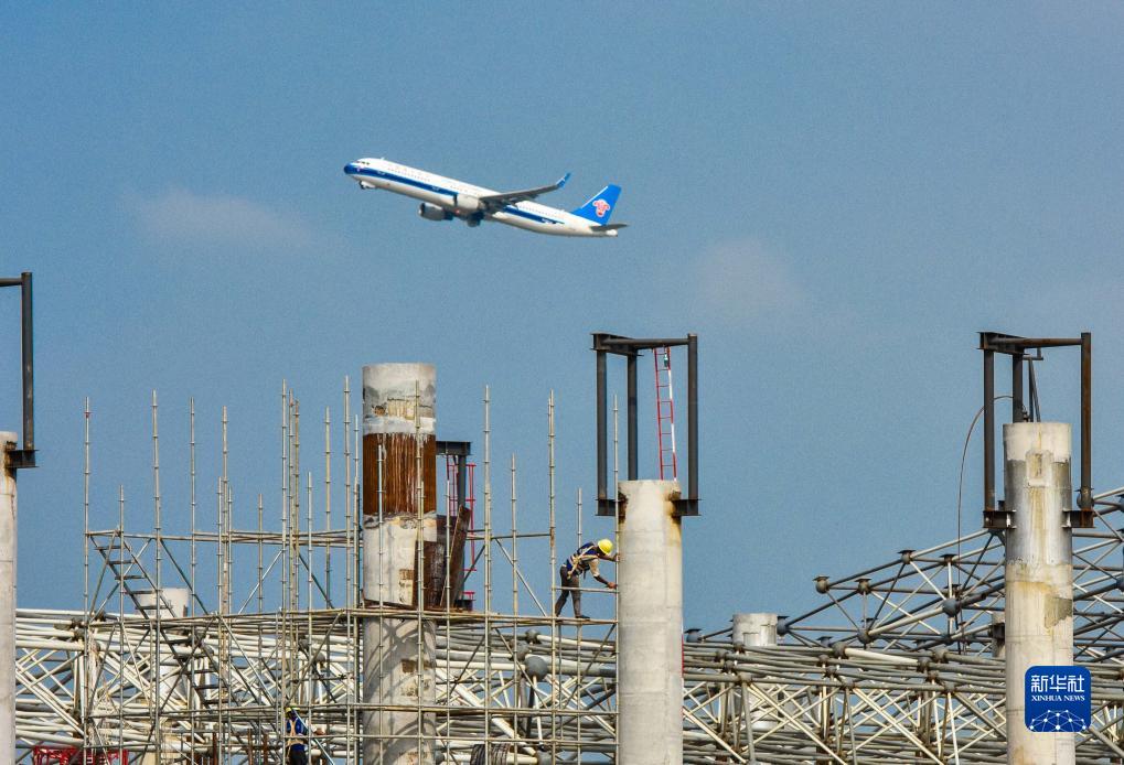9月27日,一架飛機從廣州白云國際機場(chǎng)T3航站樓施工現場(chǎng)上空飛過(guò)。