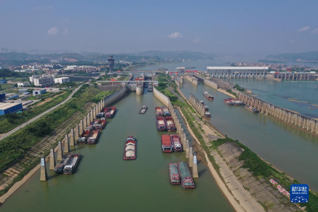 船舶通過(guò)西江廣西梧州長(cháng)洲水利樞紐船閘(無(wú)人機照片,9月27日攝)。