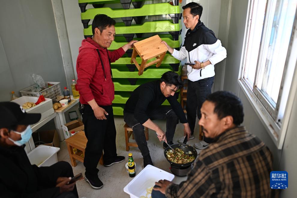 在青海省玉樹(shù)藏族自治州曲麻萊縣秋智鄉布甫村陽(yáng)光幼兒園,秋智鄉幼兒園副園長(cháng)才仁戰斗(左三)在板房?jì)葹楹⒆觽儨蕚湮绮停?月14日攝)。