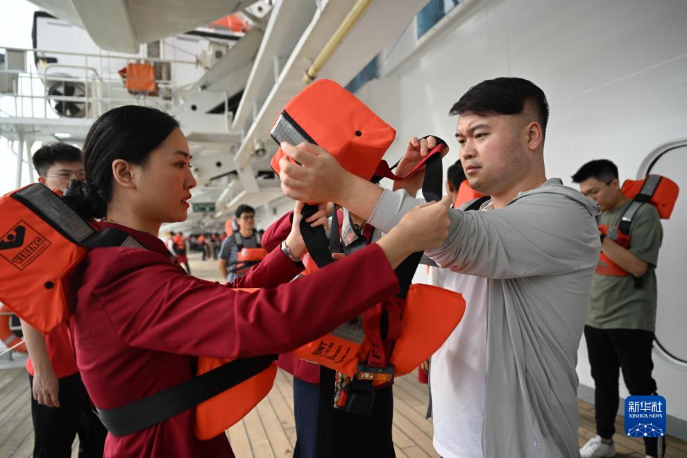9月27日,在中國船舶集團旗下愛(ài)達郵輪“地中?!碧?,工作人員指導游客進(jìn)行安全演習。