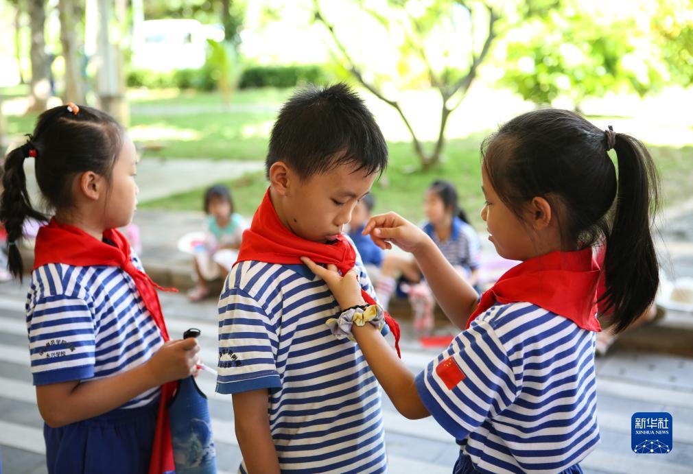 9月27日,海南省三沙市永興學(xué)校的少先隊員們在“童心向祖國,我為祖國獻首歌”活動(dòng)中佩戴紅領(lǐng)巾。