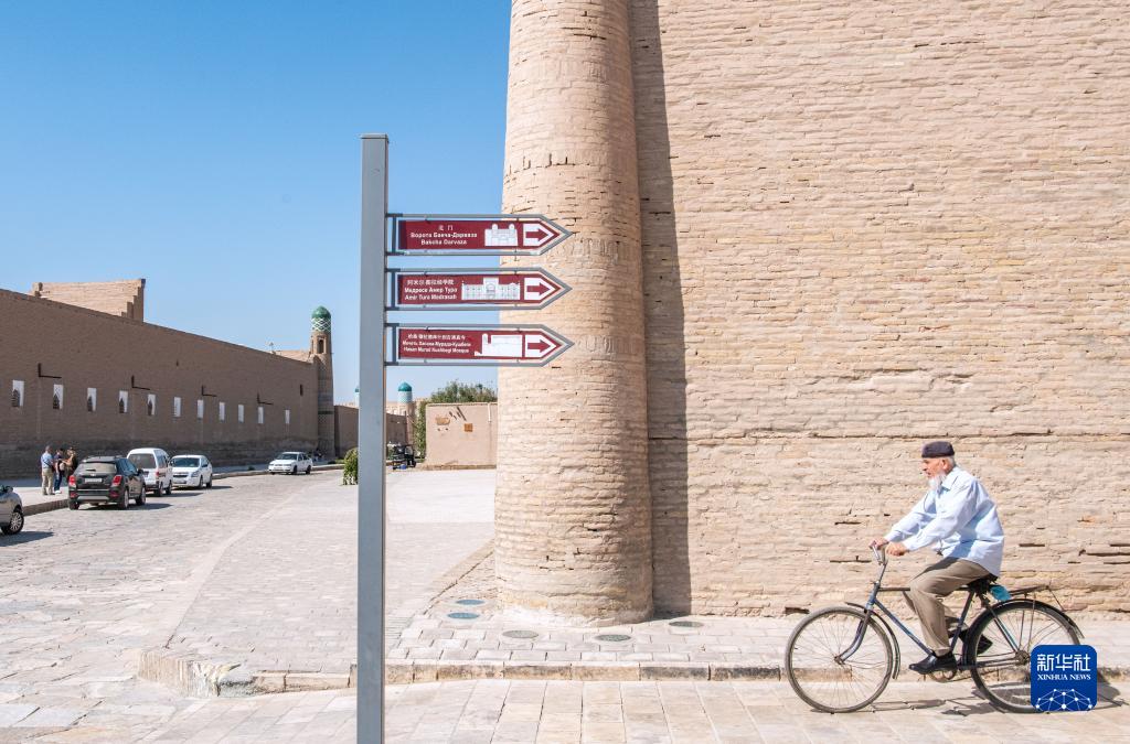 9月22日,在烏茲別克斯坦花拉子模州的希瓦古城,騎車(chē)人從古建筑路標旁經(jīng)過(guò)。路標指示出阿米爾·圖拉經(jīng)學(xué)院和哈?!つ吕聨焓矂e吉清真寺的位置,并有中文標示。