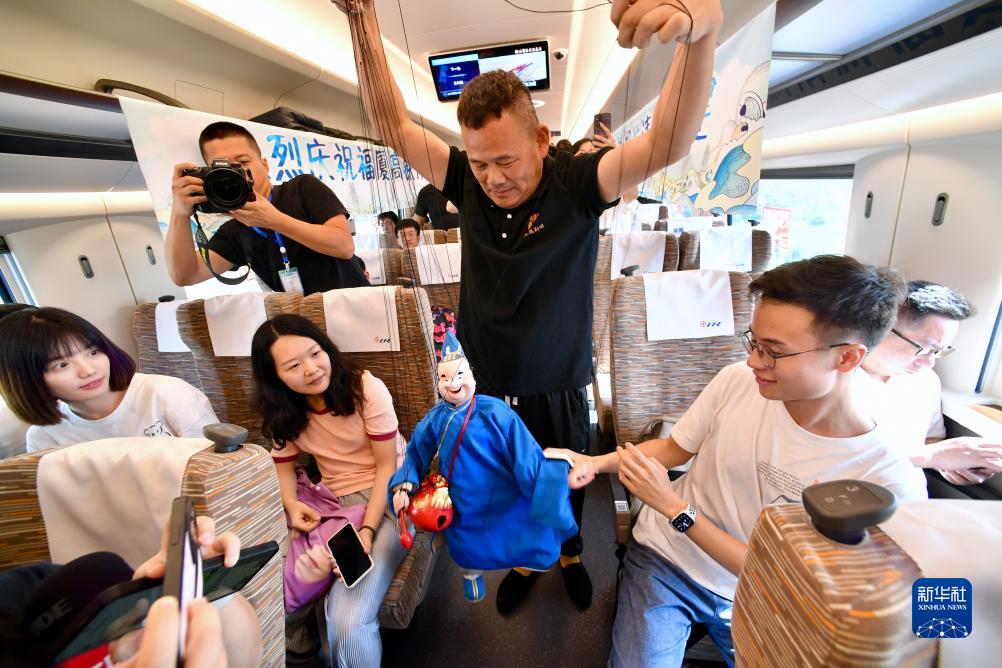 9月28日,在福廈高鐵首趟復興號智能動(dòng)車(chē)組G9801次列車(chē)上,木偶表演者在為乘客表演提線(xiàn)木偶。
