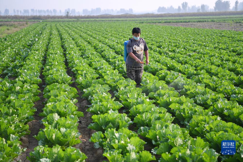 9月26日,河北保定涿州市刁窩鎮潘各莊村農民在補種的白菜地里噴灑農藥。