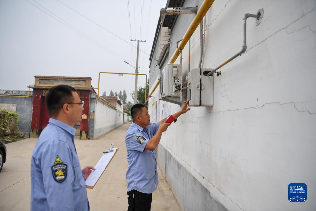 9月27日,工作人員在遭受洪水影響的河北保定高碑店市潘家營(yíng)村查驗燃氣設備運行情況。