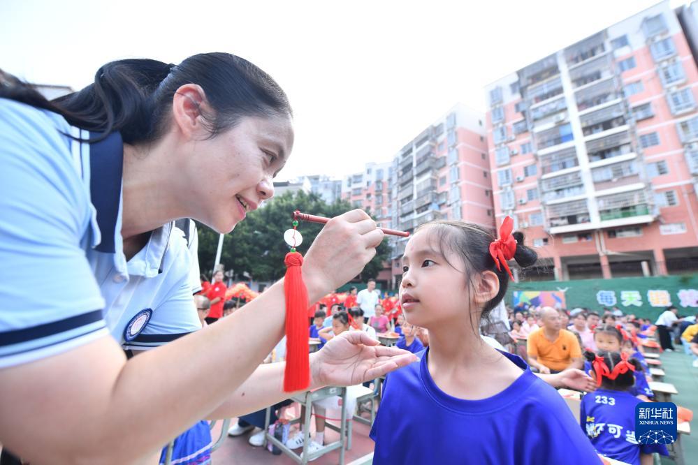 9月28日,梧州市龍圩區龍圩中心小學(xué)老師為一年級新生點(diǎn)朱砂啟智。