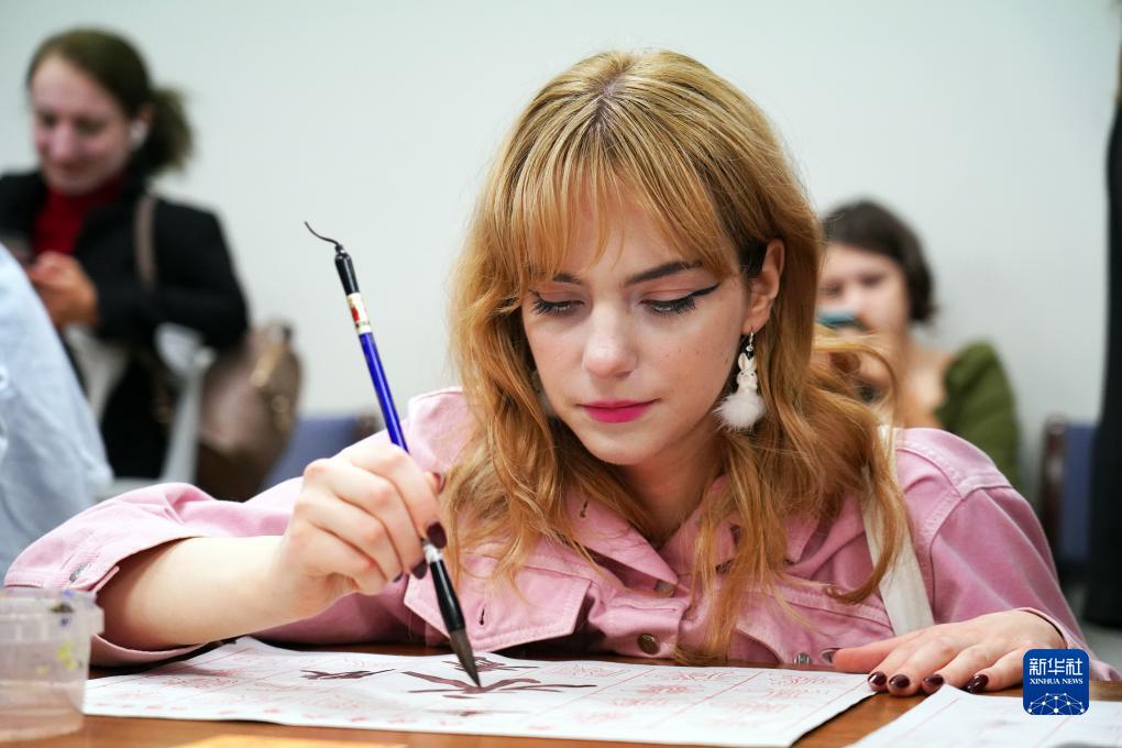 9月25日, 在拉脫維亞首都里加的拉脫維亞大學(xué)禮堂,一名拉脫維亞女青年在中國文化工作坊活動(dòng)上學(xué)習中國書(shū)法。