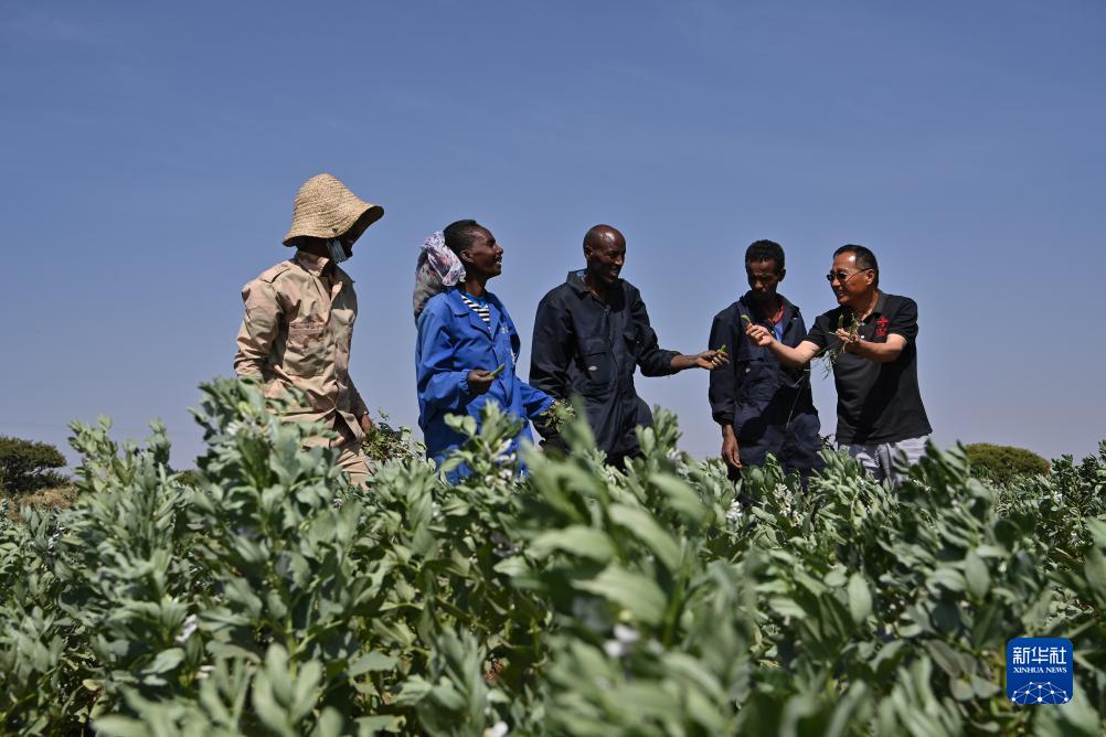 9月27日,在位于厄立特里亞阿斯馬拉的農業(yè)技術(shù)援助項目示范地,中國援厄第三期高級農業(yè)專(zhuān)家組豆類(lèi)作物專(zhuān)家劉運民(右一)與當地農戶(hù)交流。