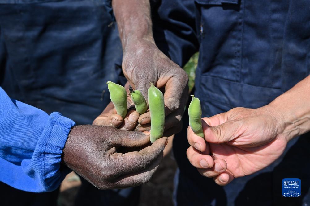 9月27日,在位于厄立特里亞阿斯馬拉的農業(yè)技術(shù)援助項目示范地,中國援厄第三期高級農業(yè)專(zhuān)家組豆類(lèi)作物專(zhuān)家劉運民(右一)與當地農戶(hù)比對蠶豆作物的生長(cháng)狀態(tài)。