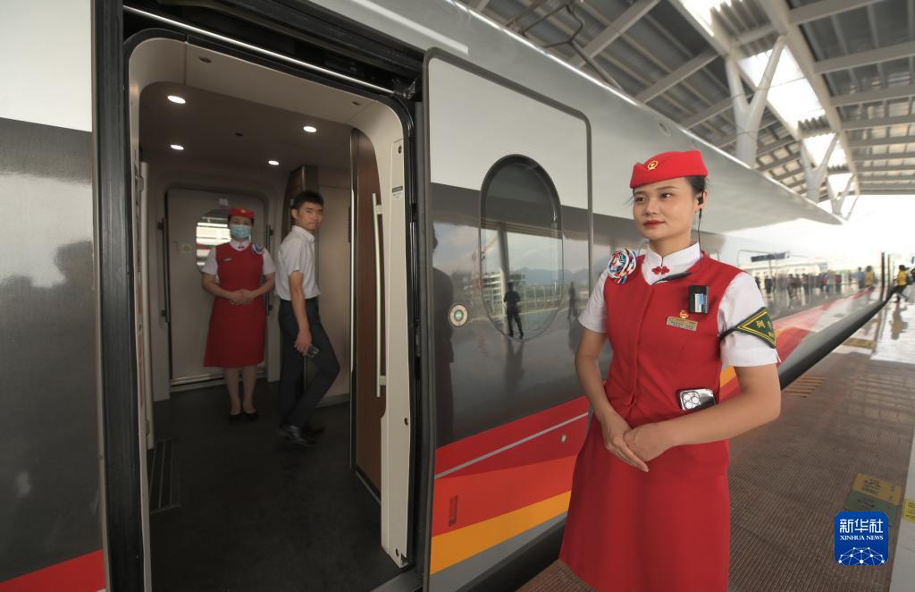 首發(fā)車(chē)G9801次列車(chē)長(cháng)車(chē)艷雪和她的同事登上福廈高鐵復興號智能動(dòng)車(chē)組為乘客服務(wù)?!霸诹熊?chē)上我們要用心用情做好服務(wù),讓乘坐福廈高鐵的乘客在旅行中享受到不一樣的跨海之旅,展現我們海上‘高姐’的風(fēng)采?!避?chē)艷雪說(shuō)。