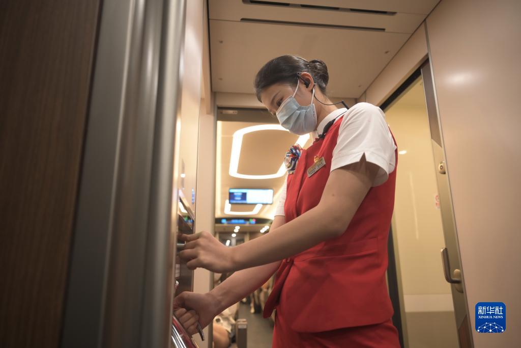 9月28日,列車(chē)員趙怡君在車(chē)廂工作中。