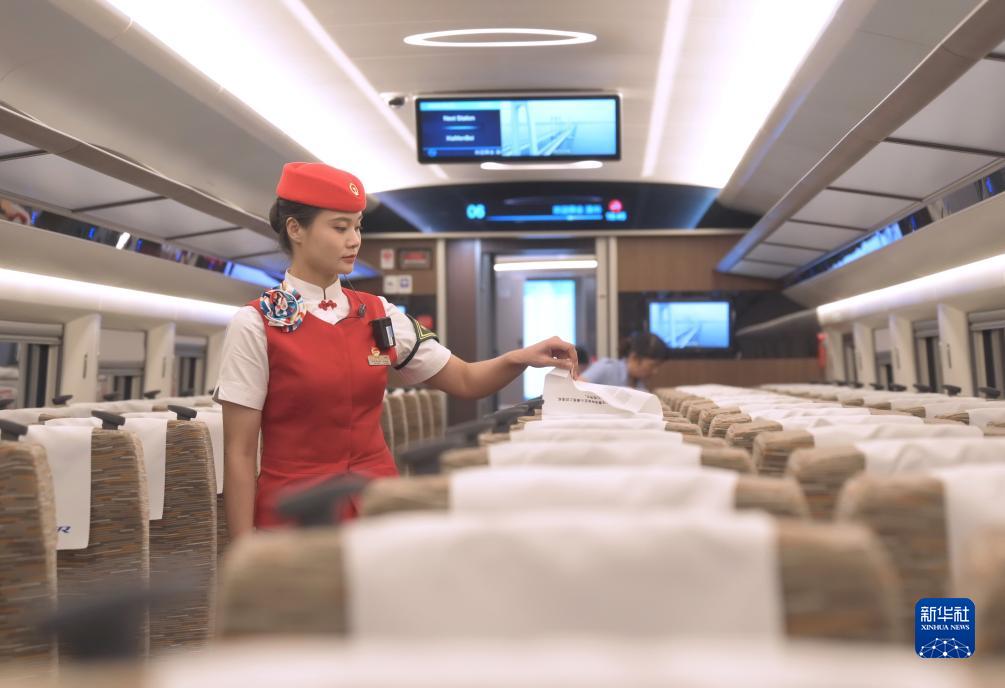 首發(fā)車(chē)G9801次列車(chē)長(cháng)車(chē)艷雪和她的同事登上福廈高鐵復興號智能動(dòng)車(chē)組為乘客服務(wù)?!霸诹熊?chē)上我們要用心用情做好服務(wù),讓乘坐福廈高鐵的乘客在旅行中享受到不一樣的跨海之旅,展現我們海上‘高姐’的風(fēng)采?!避?chē)艷雪說(shuō)。