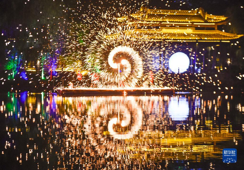 9月29日,民間藝人在江蘇省鎮江句容市寶華山國家森林公園表演打鐵花。