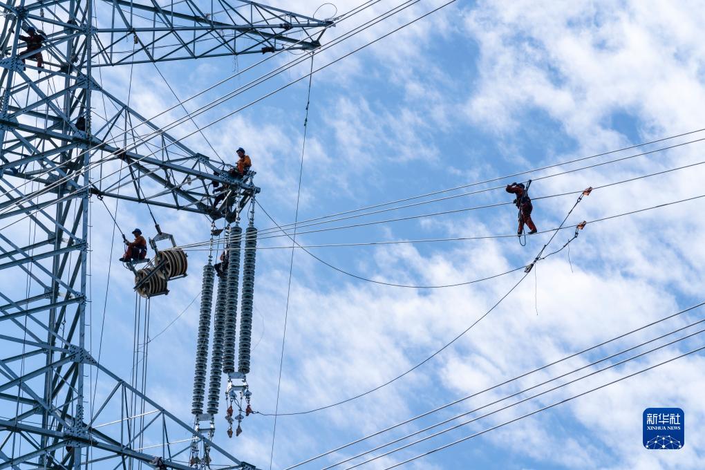 9月29日,陜西省西安市鄠邑區搖東村,工人們在新建的高壓線(xiàn)塔上排線(xiàn)作業(yè)。