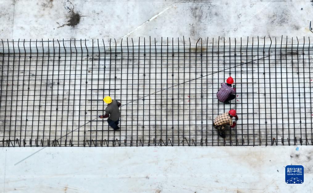 9月30日,在江蘇省揚州市一處建設工地,工人在施工現場(chǎng)工作(無(wú)人機照片)。
