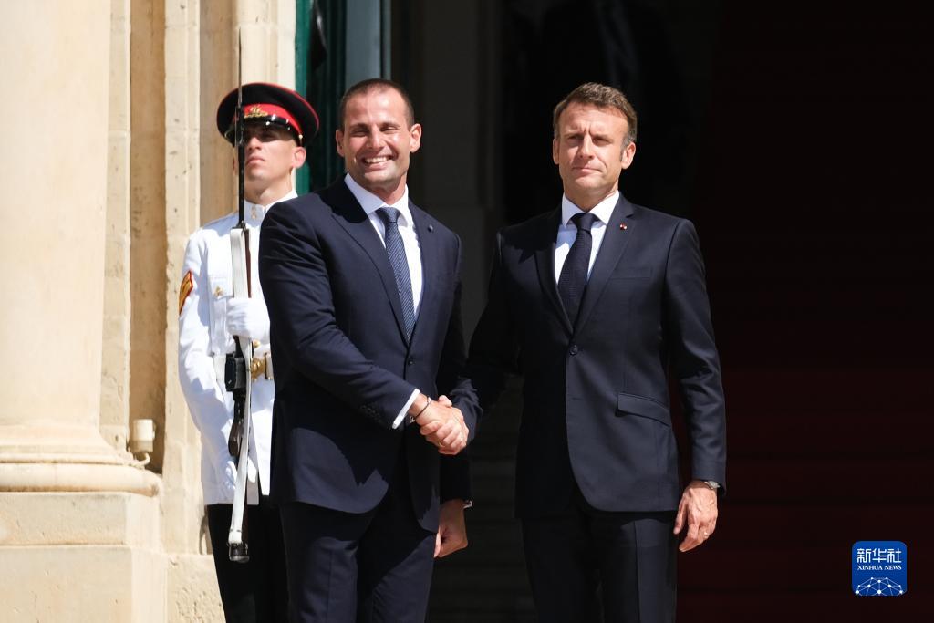 9月29日,在馬耳他瓦萊塔,馬耳他總理阿貝拉(前左)歡迎前來(lái)參會(huì )的法國總統馬克龍(前右)。