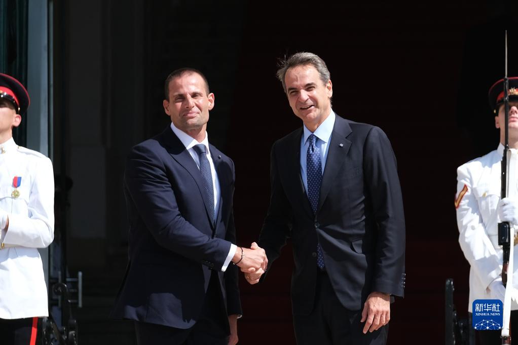 9月29日,在馬耳他瓦萊塔,馬耳他總理阿貝拉(前左)歡迎前來(lái)參會(huì )的希臘總理米佐塔基斯(前右)。